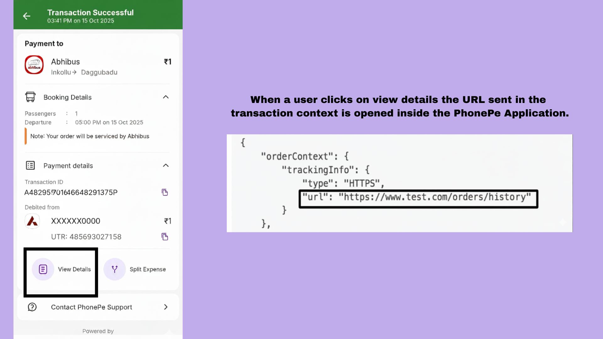 URL is sent in the initiate-service-request API. This object is used to open the page for this particular order. (User can open this URL through PhonePe’s transaction page, “View Details” button)
